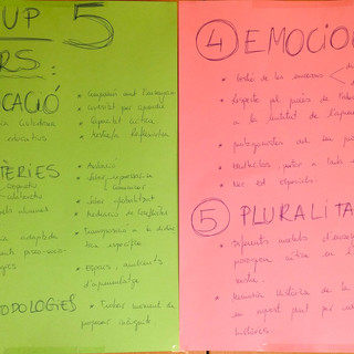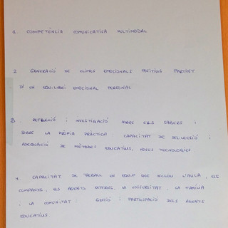 El treball de reflexió i proposta es va plantejar desde sessions de treball en grups i posada en comú de les conclusions. La primera tasca va ser identificar els sabers que considerem necessaris en la formació de mestres per a després posar-los en relació amb les competències establertes per a la normativa dels Graus.